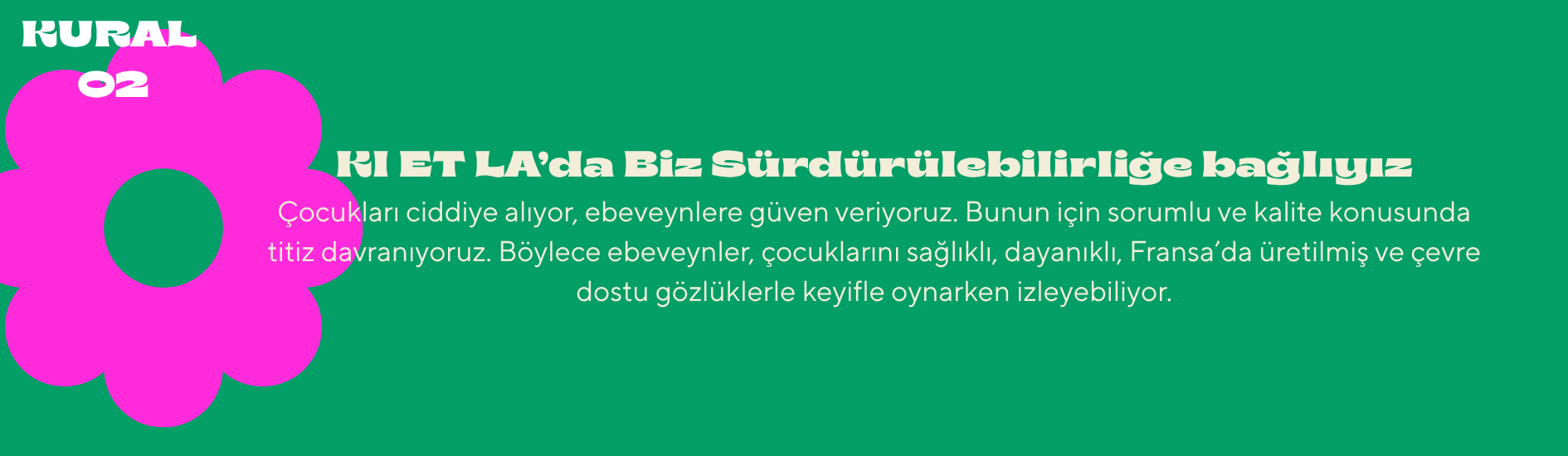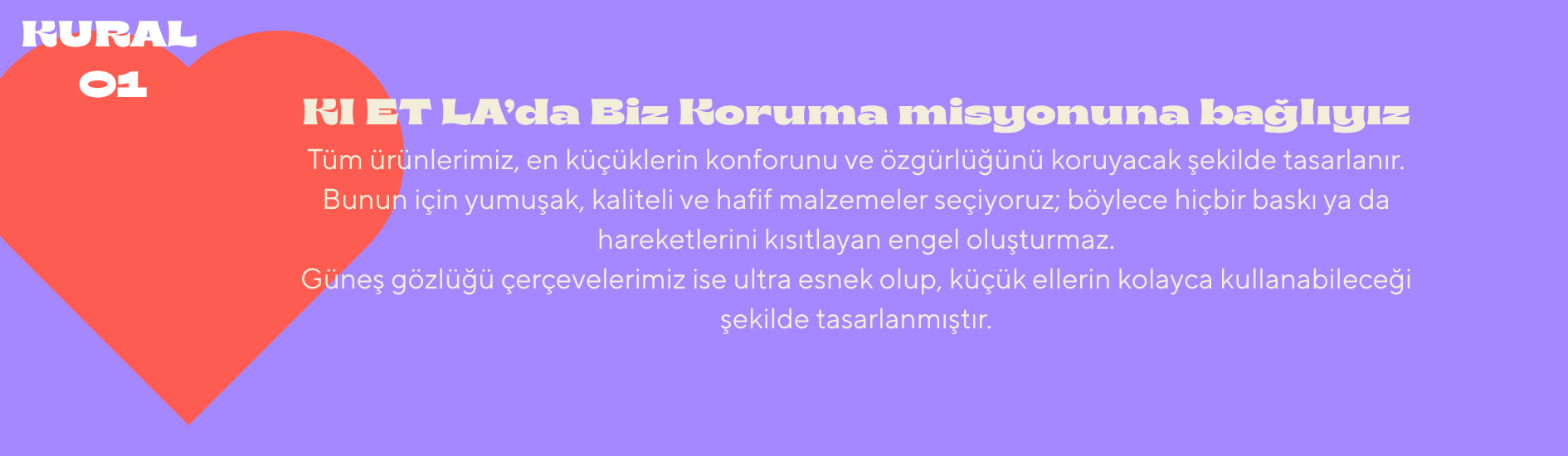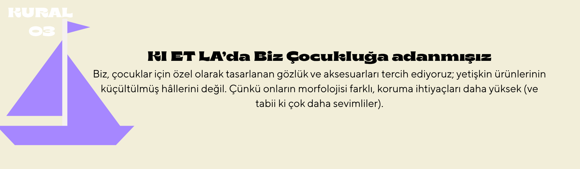 - KI ET LA'da felsefemizin temelinde çocukların ihtiyaçlarını özel olarak düşünmek yer alır. Maksimum koruma sağlarken sevimliliği de yakalamak için tasarlanmış benzersiz gözlük ve aksesuarlar yaratıyoruz.