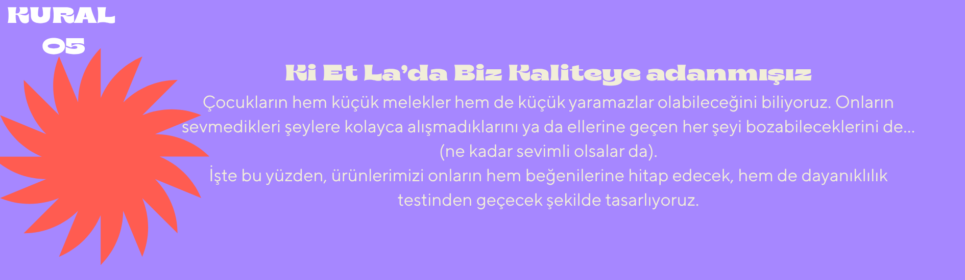 - KI ET LA olarak çocukları, mutluluklarını değiştirebilecek görünmez risklerden korumaya kararlıyız. Ürünlerimiz küçüklerin konforunu ve özgürlüğünü garanti etmek için özenle tasarlanmıştır.